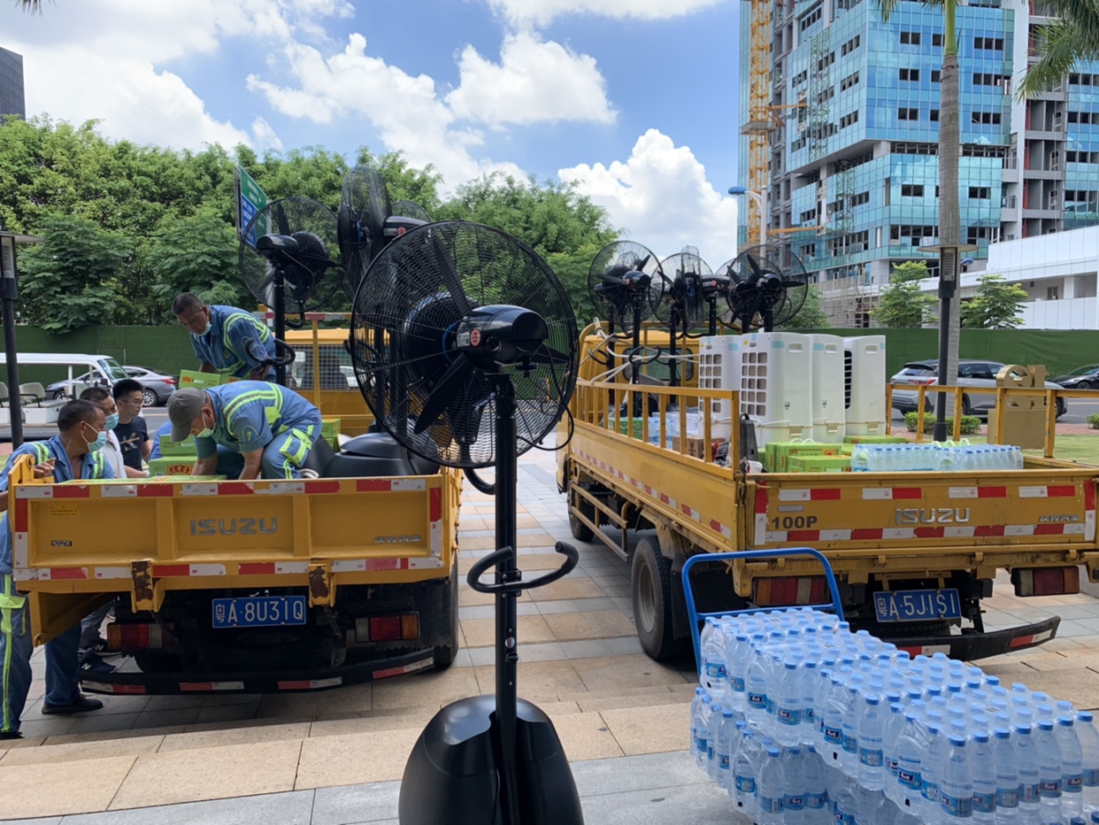 廣州正值炎夏,白天氣溫可達30℃+,為解決戶外悶熱問題,一批德通霧化降溫風扇使用于抗疫一線,為醫護人員及民眾帶來絲絲清涼。
